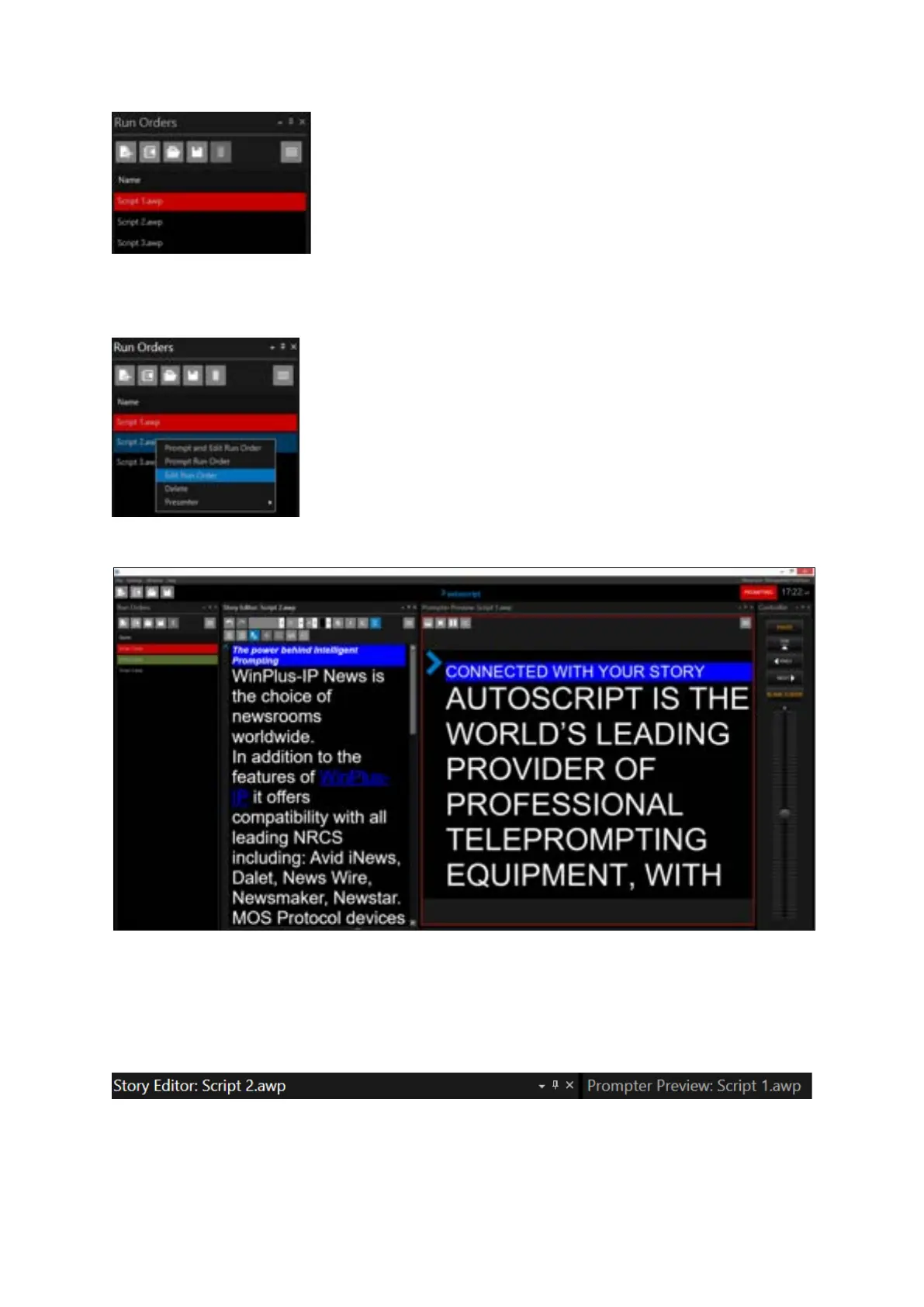 Script 2 is now in the Story Editor pane and Script 1 is still the Prompter Preview pane (the live script)