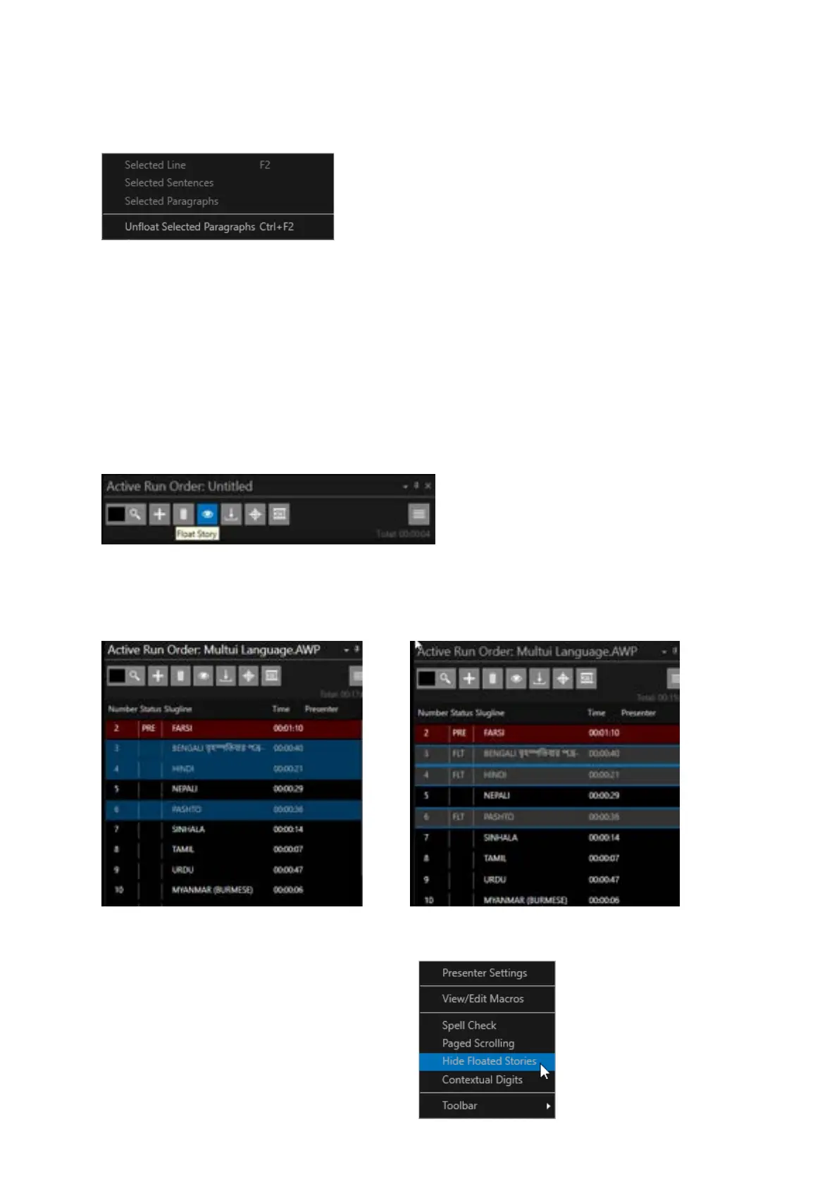 When the Float Story button (of F2) is clicked stories 3, 4 & 6 will show FLT (Floated) in the Status