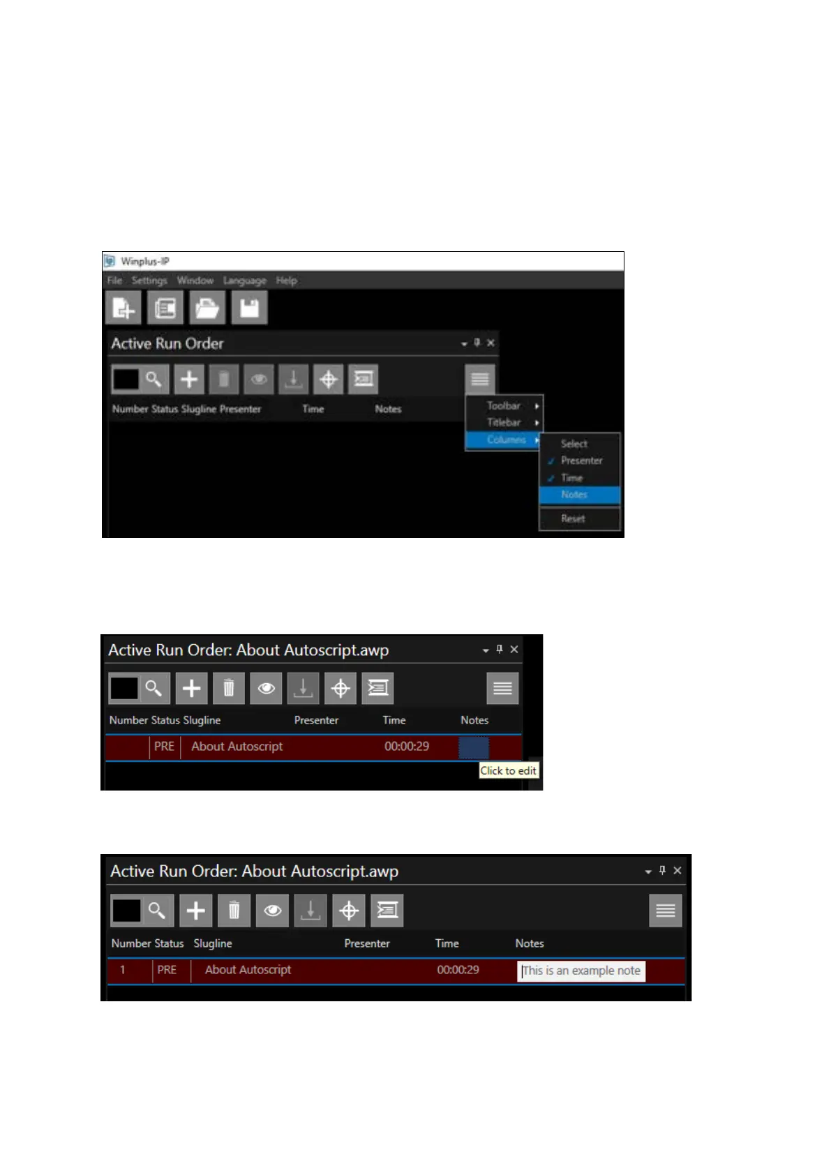 To display the notes column in the Active Run Order pane click the burger then Columns, Notes.
