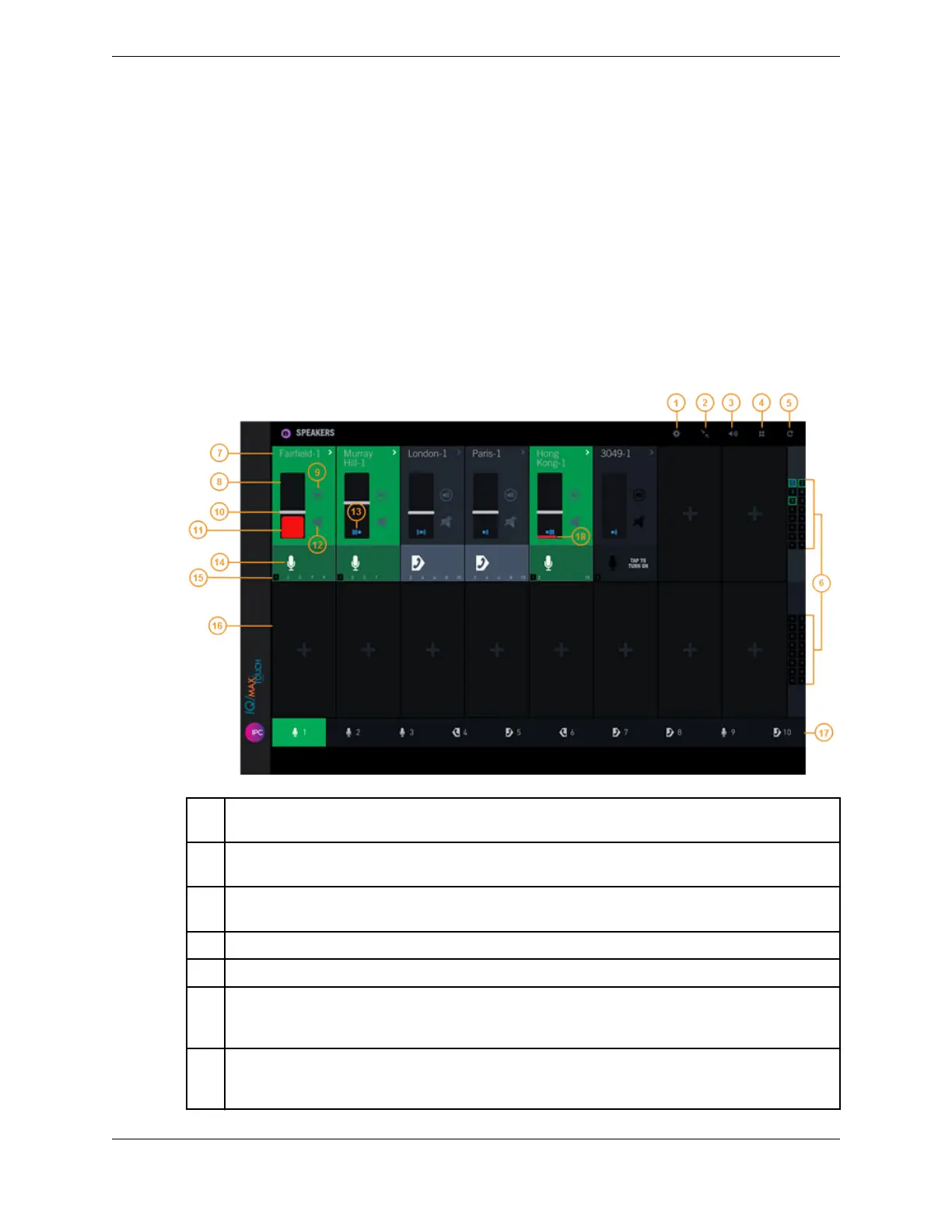 7 Speaker channel: Main control for a speaker channel. Tap the speaker label area to display a