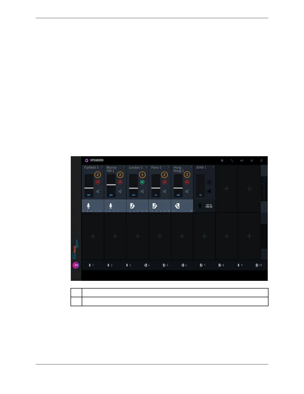 2 Other active speaker channels, volume decreased (red speaker solo mode icon)