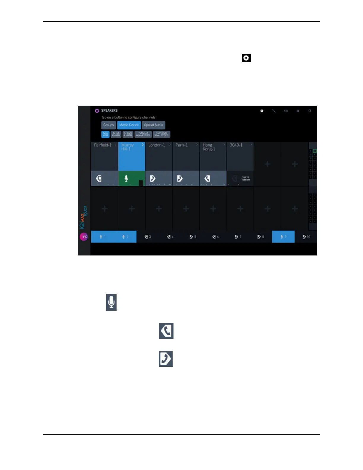 All speaker channels and groups assigned to the currently selected media device are highlighted with