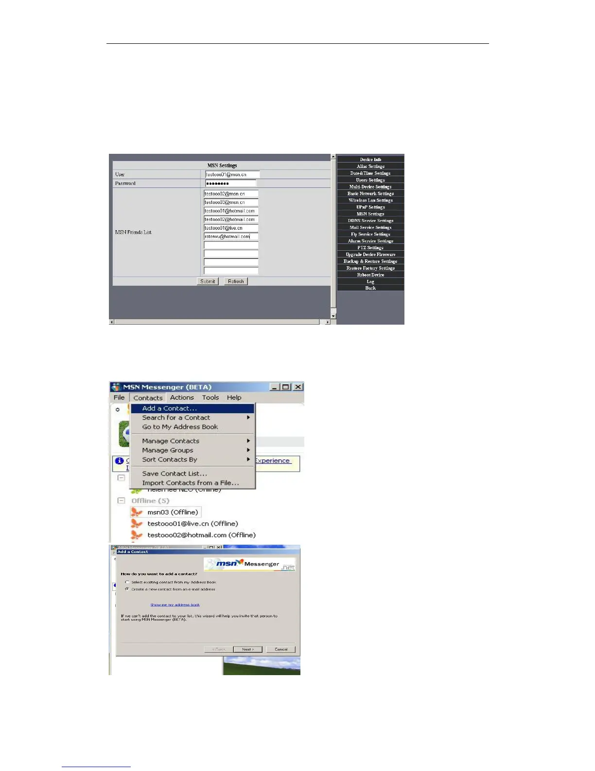 First login and click "add contacts " choose Add Contact ,then fill IPCAM‟s MSN account