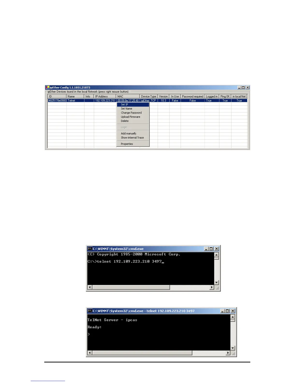 In the command shell you type „telnet [IP-Adress from the device] [Port]“ to