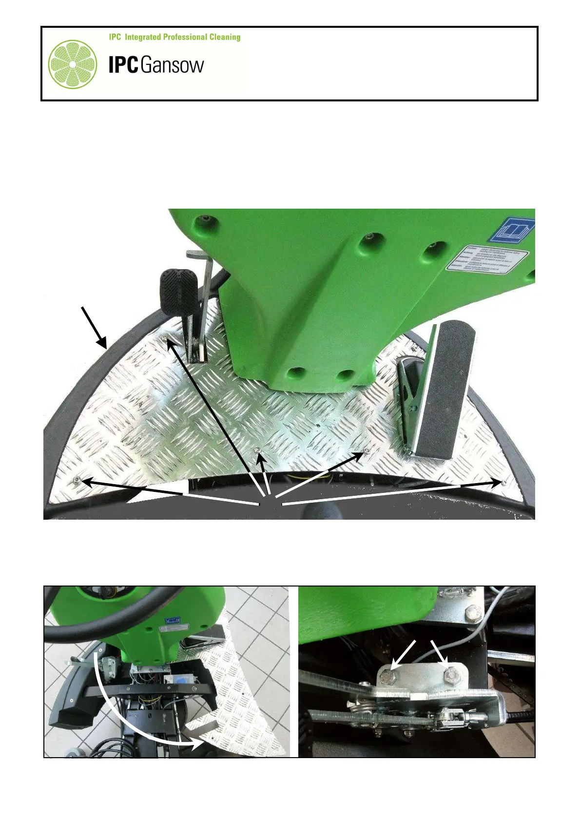 Unscrew the two screws D fastening the pedal E to the chassis.