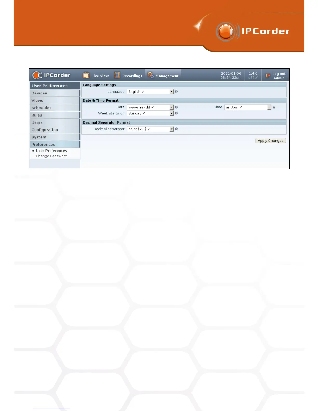 Each user can change his/her personal password in the menu Management – Preferences – Change Password
