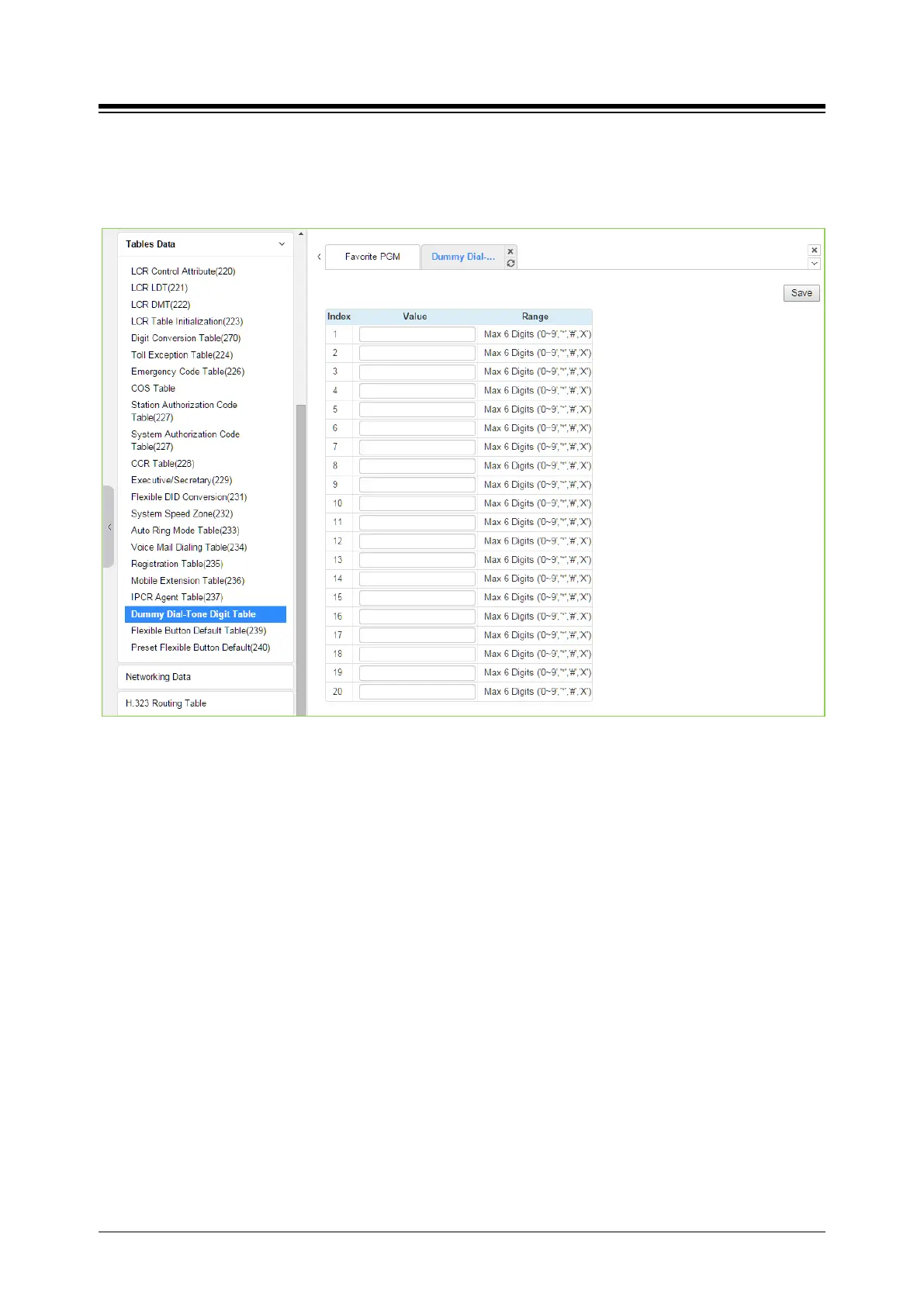 Selecting Dummy Dial-Tone Digit Table will display the Dummy Dial-Tone Digit data entry page.