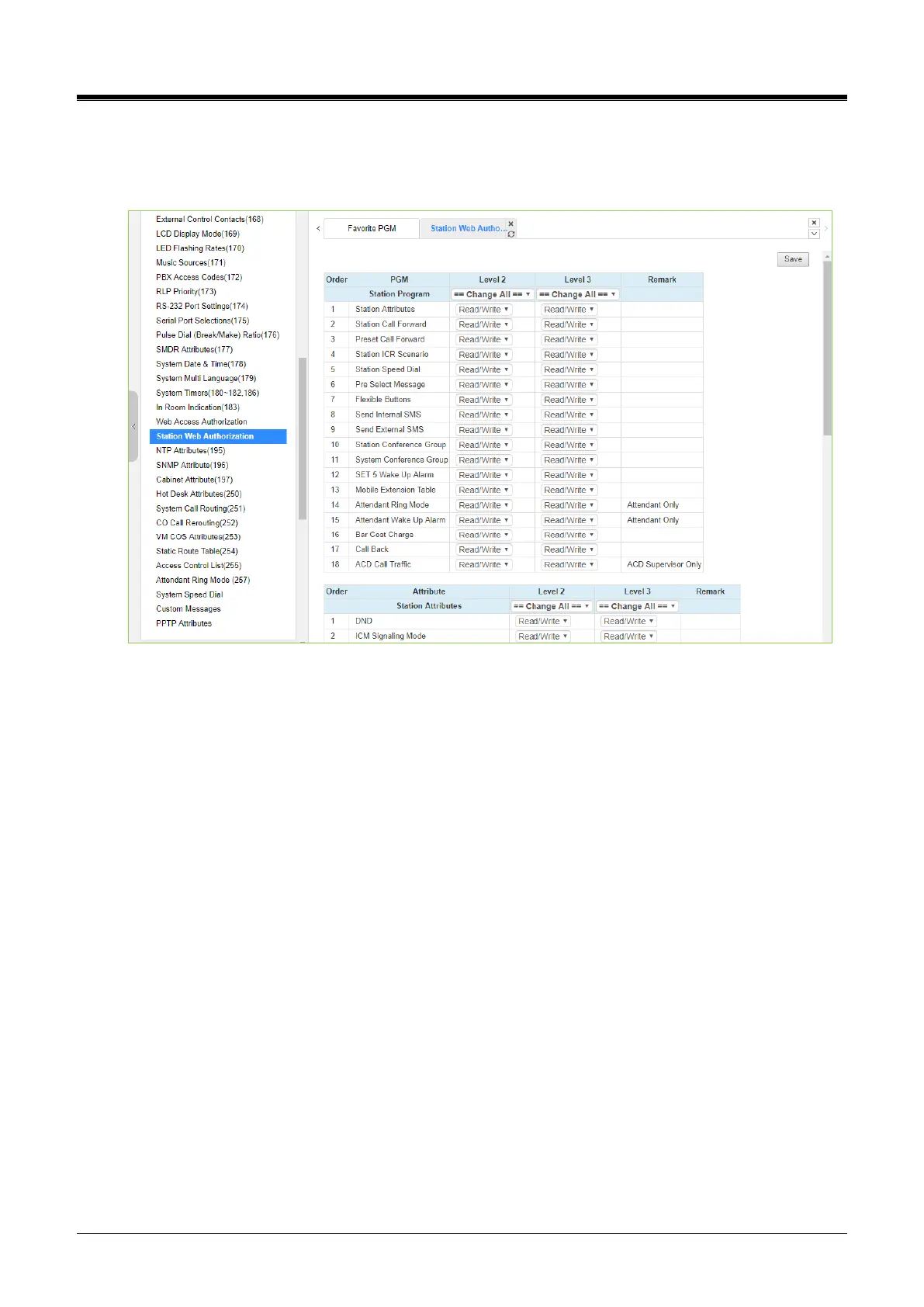 (Common Attributes (111): ‘Station Web Level’). Level 1 has access to all Station pages and attributes. The