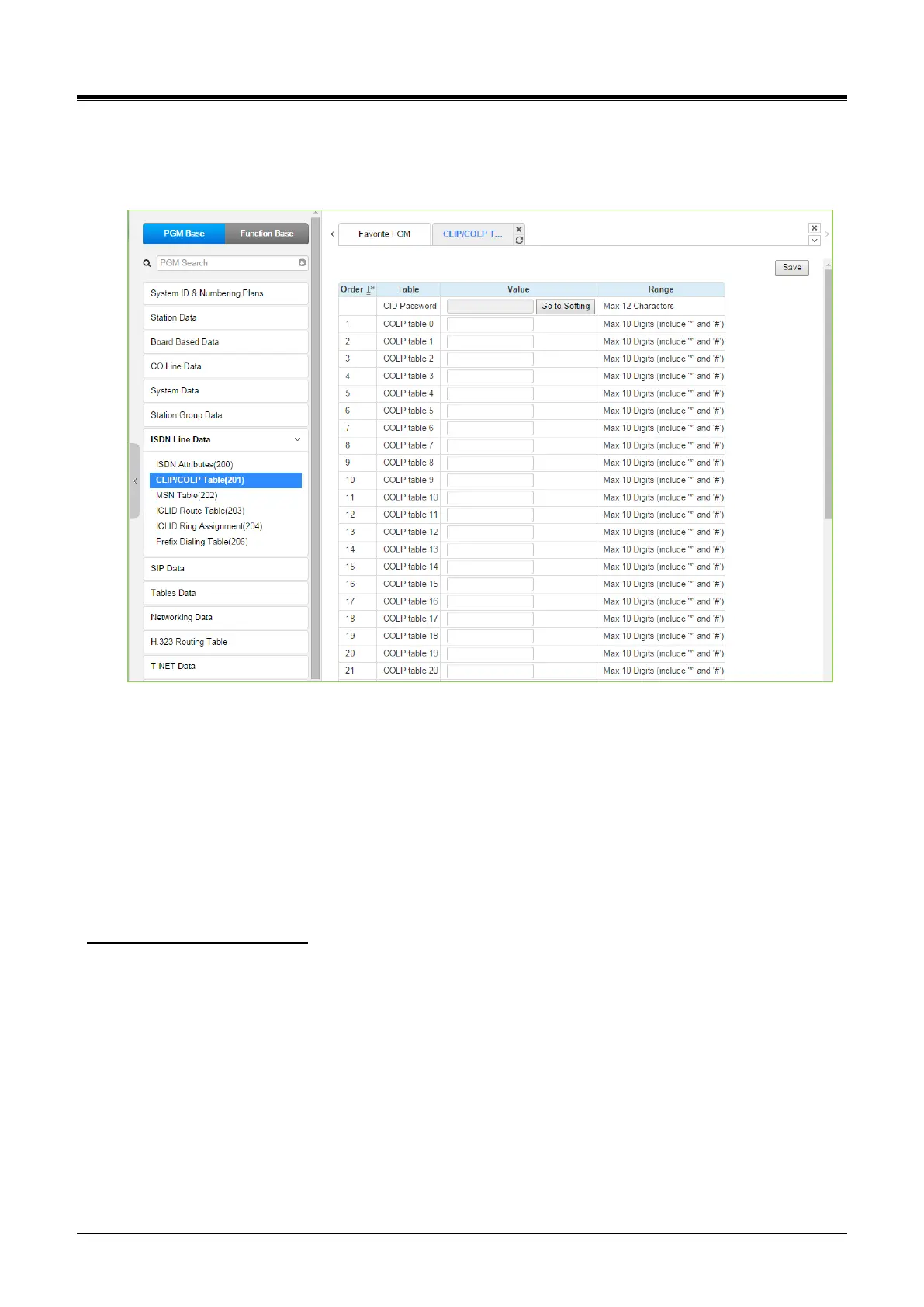 Selecting the CLIP/COLP Table will display the CLIP/COLP Table Attributes data entry page. Click the [Save]