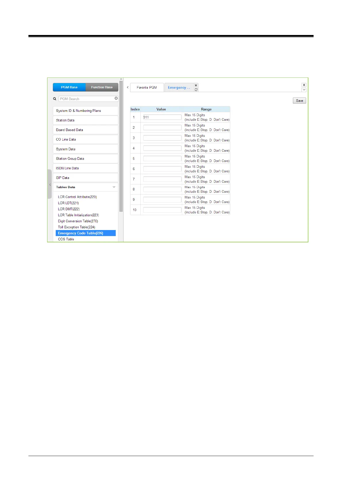 The Emergency Code Table is used to identify emergency numbers that will override all COS dialing