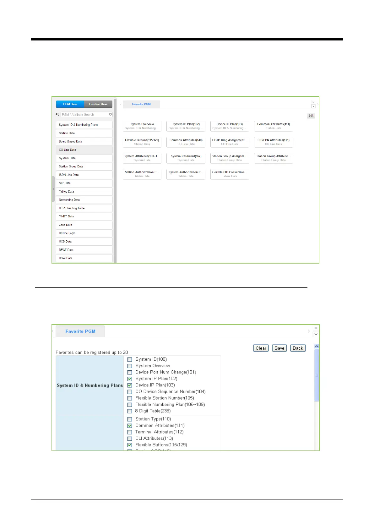 The iPECS Admin Main Page displays a Favorite PGM list to ease access to a frequently used program. The