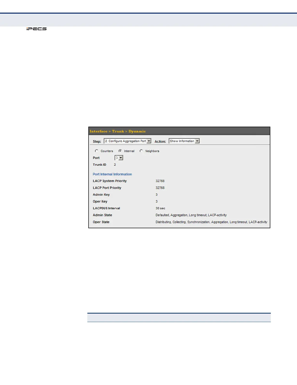 Use the Interface > Trunk > Dynamic (Configure Aggregation Port - Show