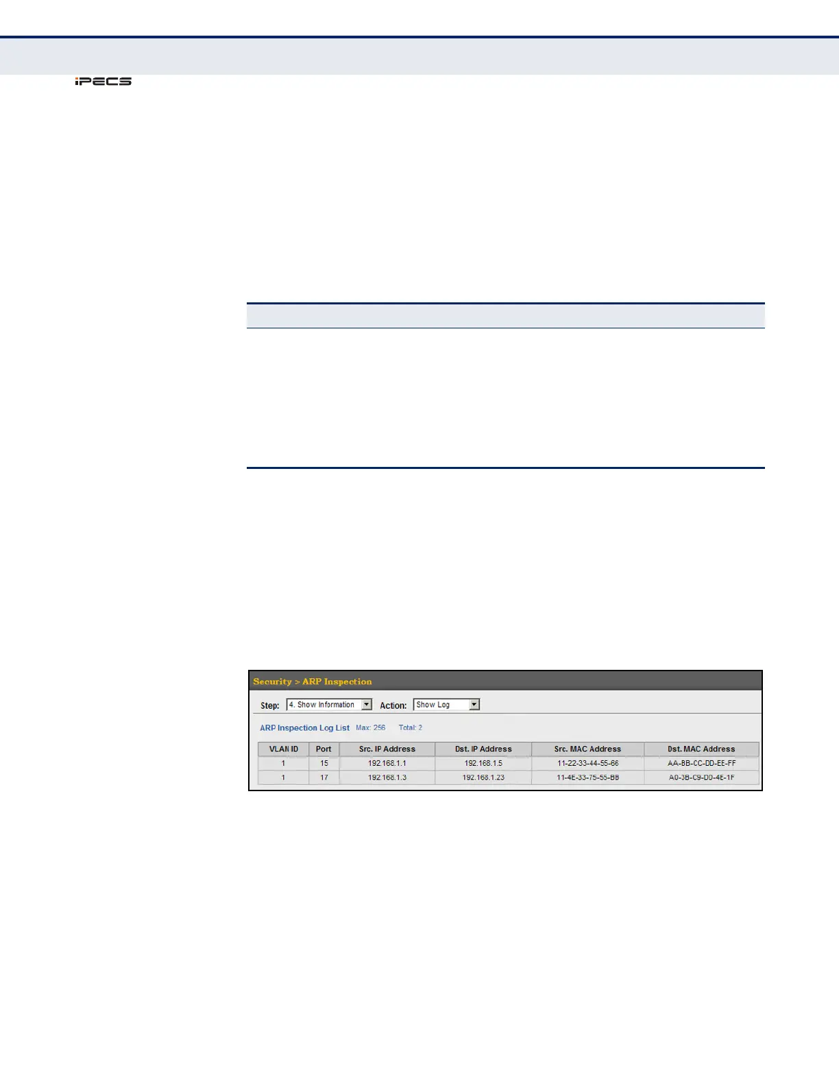 Use the Security > ARP Inspection (Show Information - Show Log) page to