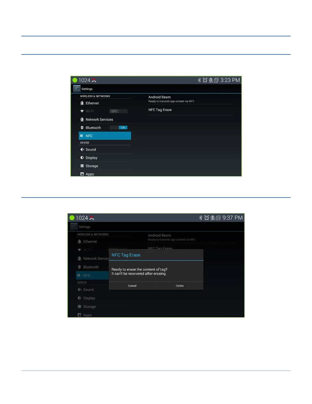 This terminal provides erase function for NFC Tag which has some information already. If user taps the tag with Erase