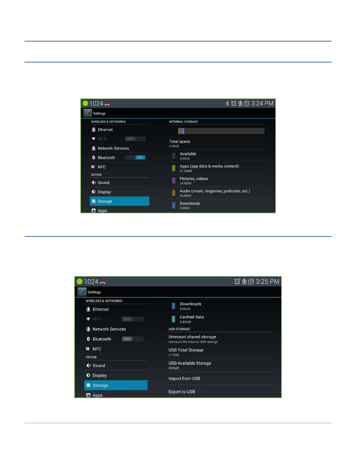 The Storage settings are provided to view and manage the internal memory and the USB stick. Settings include: