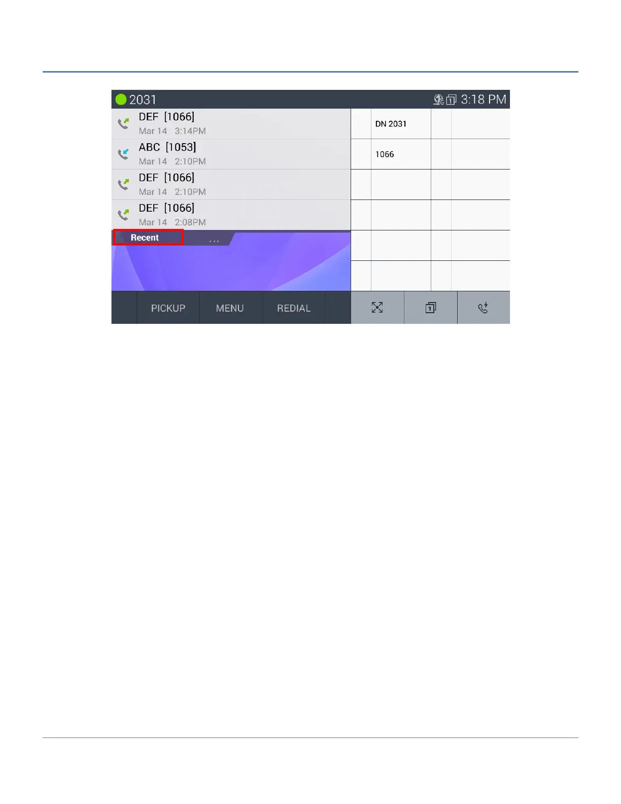 The Recent call list can display in the Call screen by touching the ‘Recent’ tab.