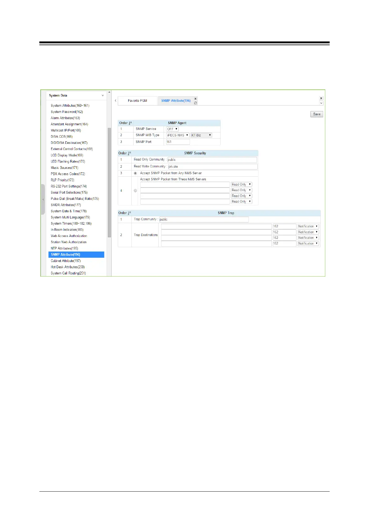 Selecting SNMP Attribute will display the SNMP Attributes entry page. Click [Save] button after