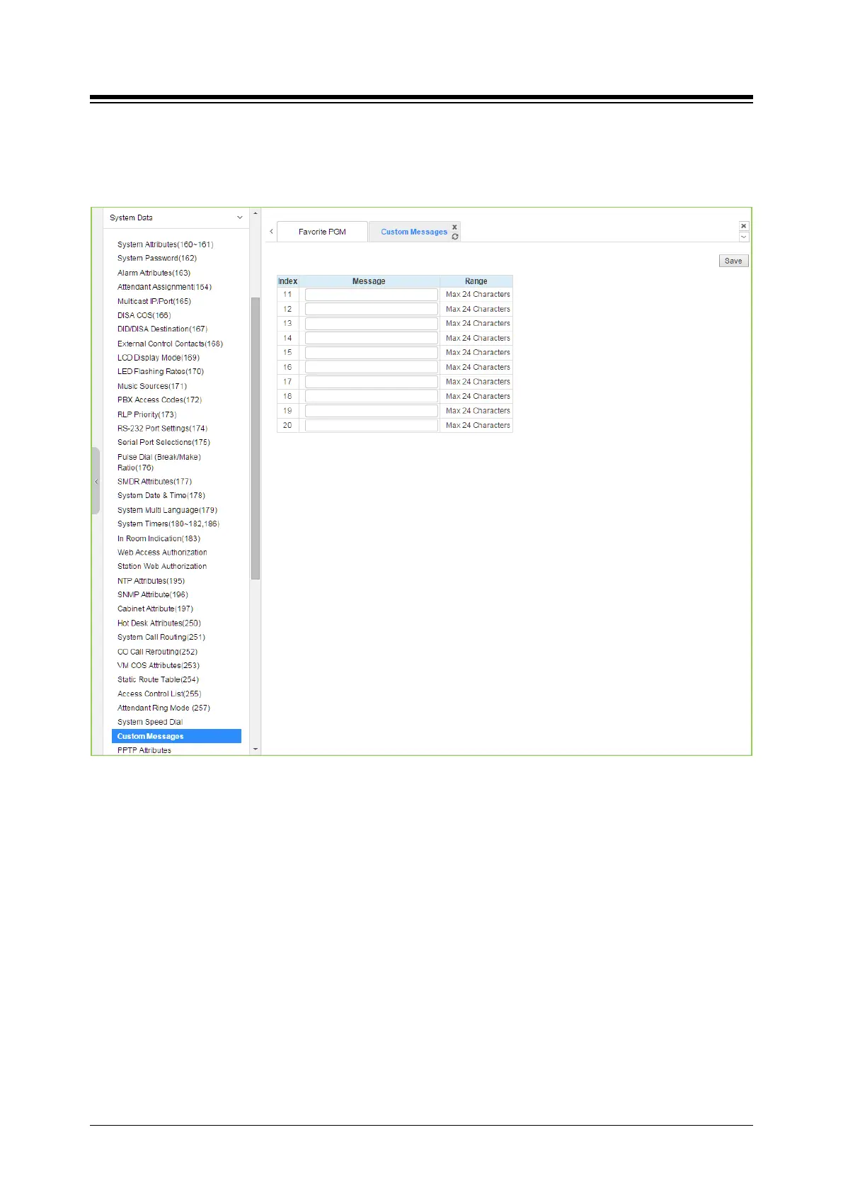 Selecting Custom Messages will display the Custom Message Table data entry page. Click [Save]