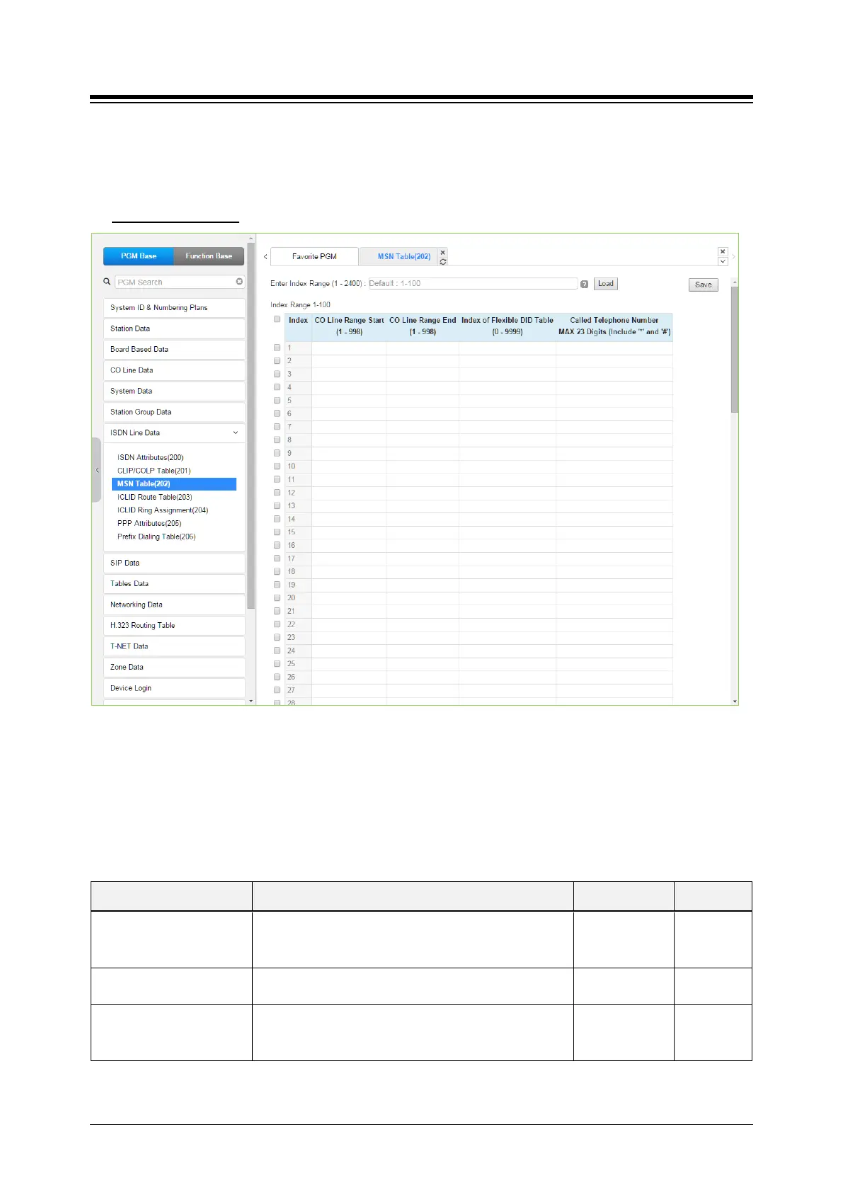 Selecting MSN Table will display the MSN Table data entry page. For convenience, the copy,