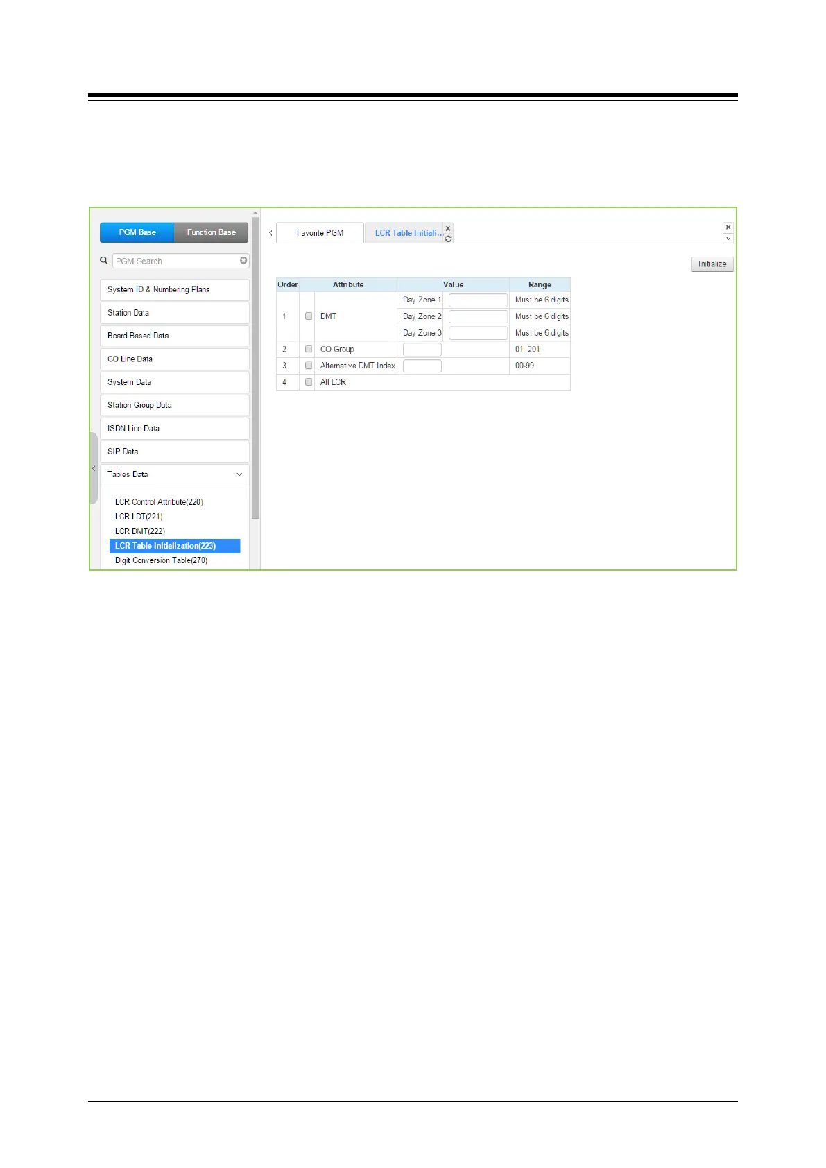 Selecting LCR Table Initialization will display the LCR Table Initialization data entry page. Click