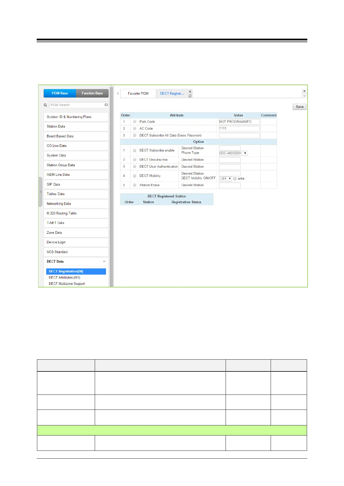 available to enable subscription, unsubscribe a DECT station, enable mobility, etc. A chart is