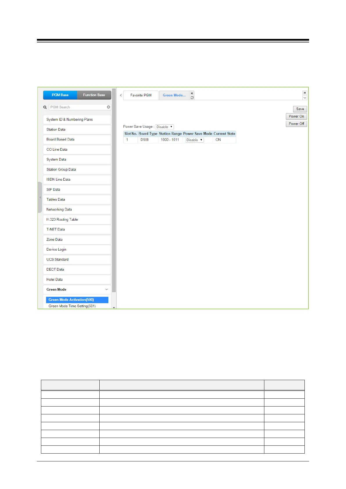 Selecting Green Mode Activation returns the page shown. Click [Save] button after changing
