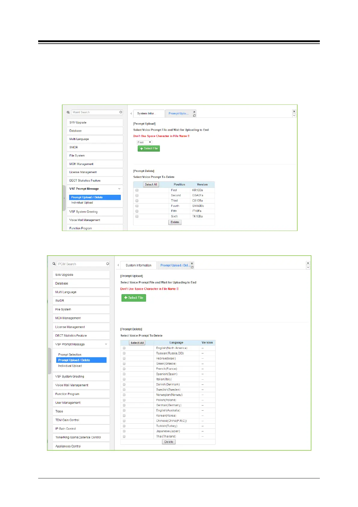 Selecting Prompt Upload/Delete displays the page shown in Figure 4.5.9.2-1 & Figure 4.5.9.2-2.