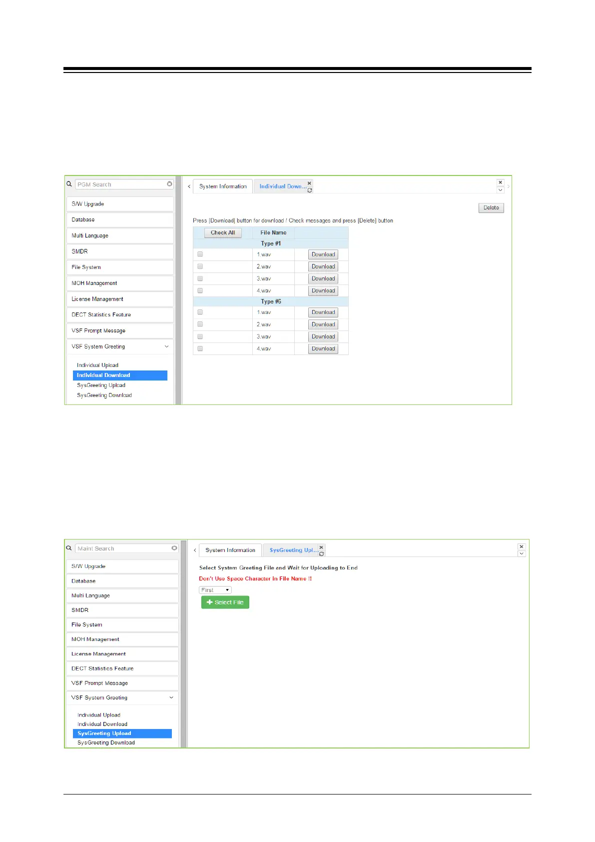 Selecting System Greeting Upload displays the page shown in figure. From this page,