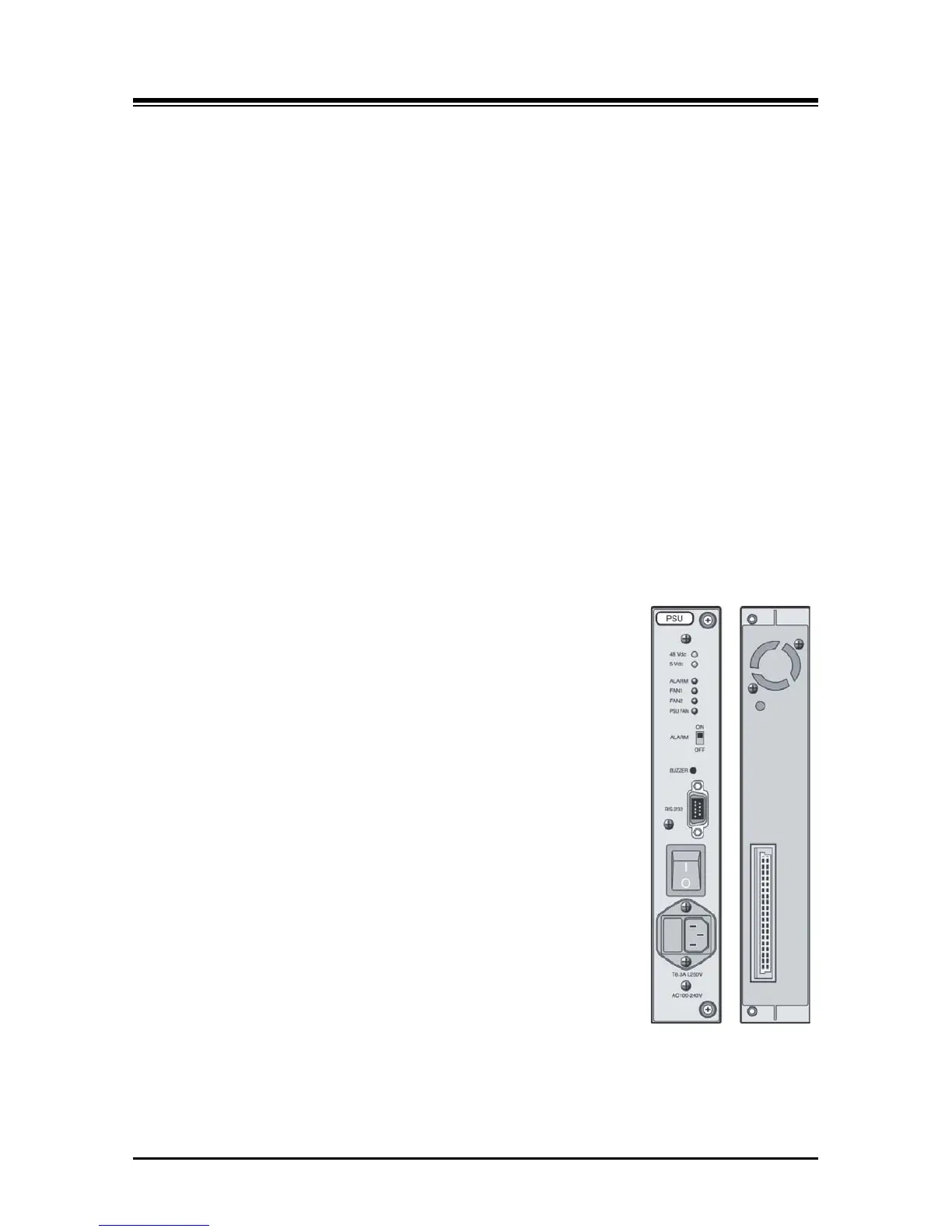 The Power Supply Unit (PSU) converts 100-240 VAC @ 50/60 Hz to -48V and 5V DC. The DC