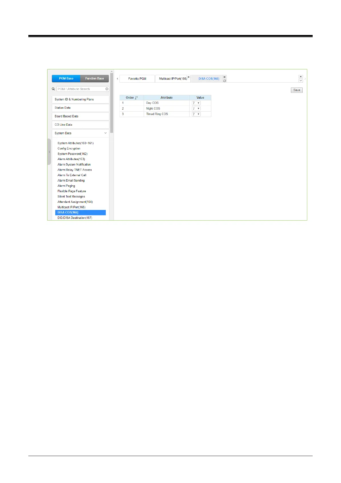 Selecting DISA COS will display the DISA COS data entry page. Click the [Save] button after changing Value.
