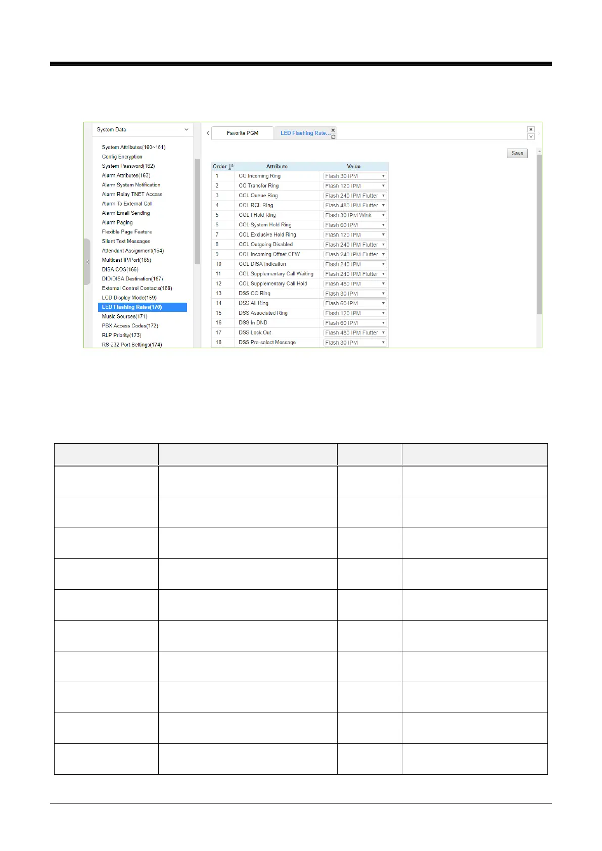 Selecting LED Flashing Rate will display the data entry page. Click the [Save] button after changing Value.