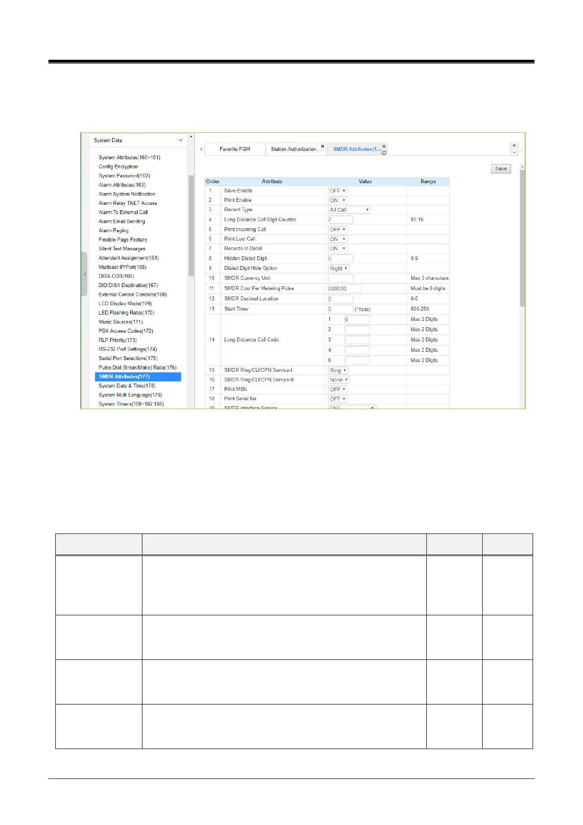 Selecting SMDR Attributes will display the SMDR Attributes data entry page. Click the [Save] button after