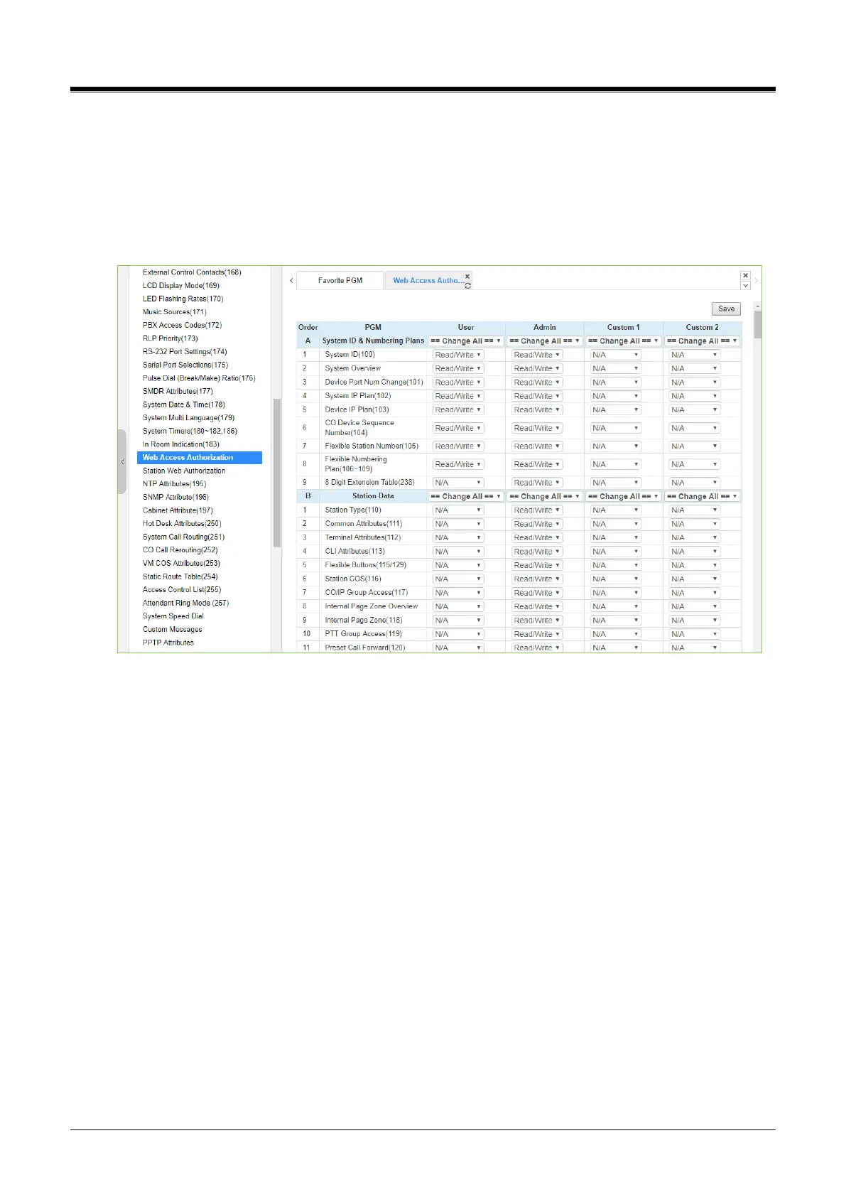 A user can select three authorization options (N/A, Read, Read/Write) only in Web Access & Station Web