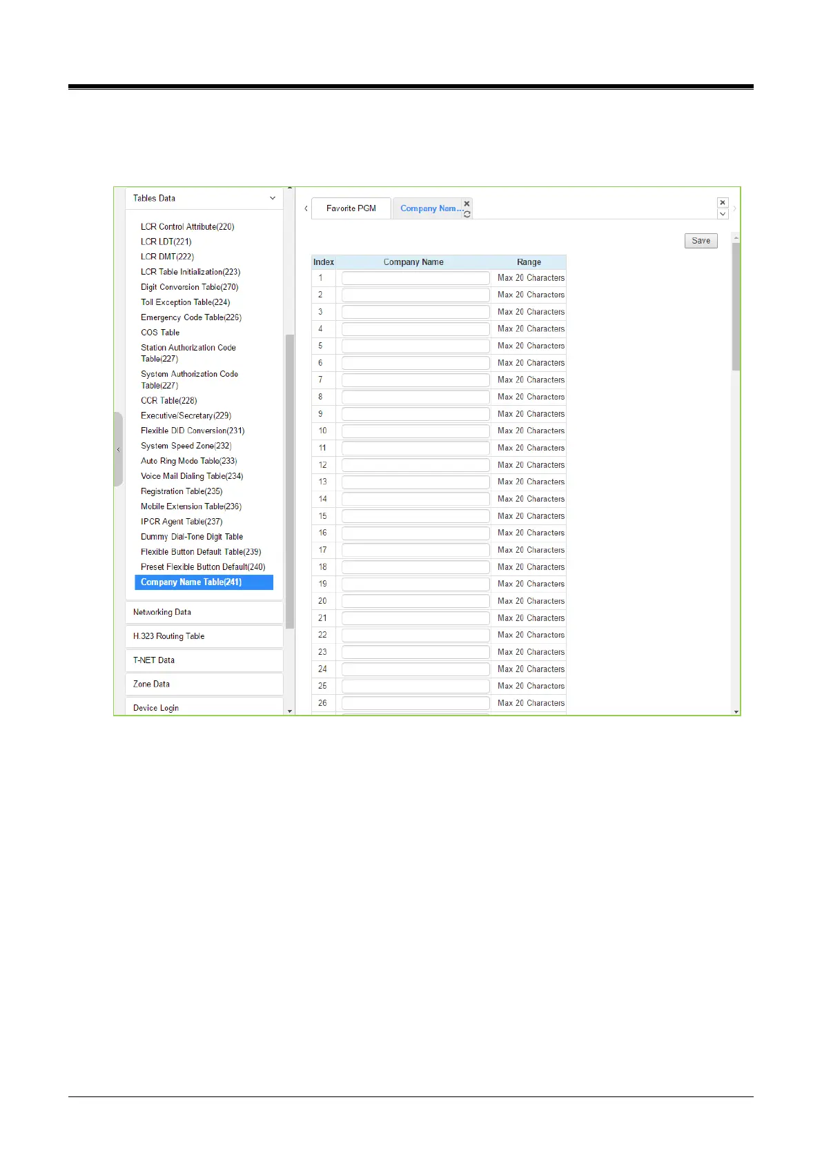 Selecting Company Name Table will display the below page. Click [Save] button after changing Company