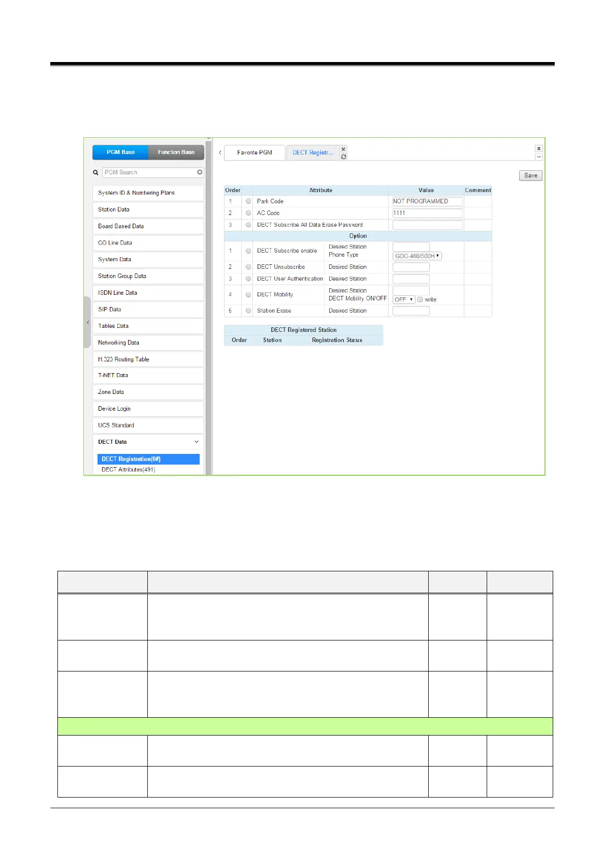 subscription, unsubscribe a DECT station, enable mobility, etc. A chart is included displaying the registered