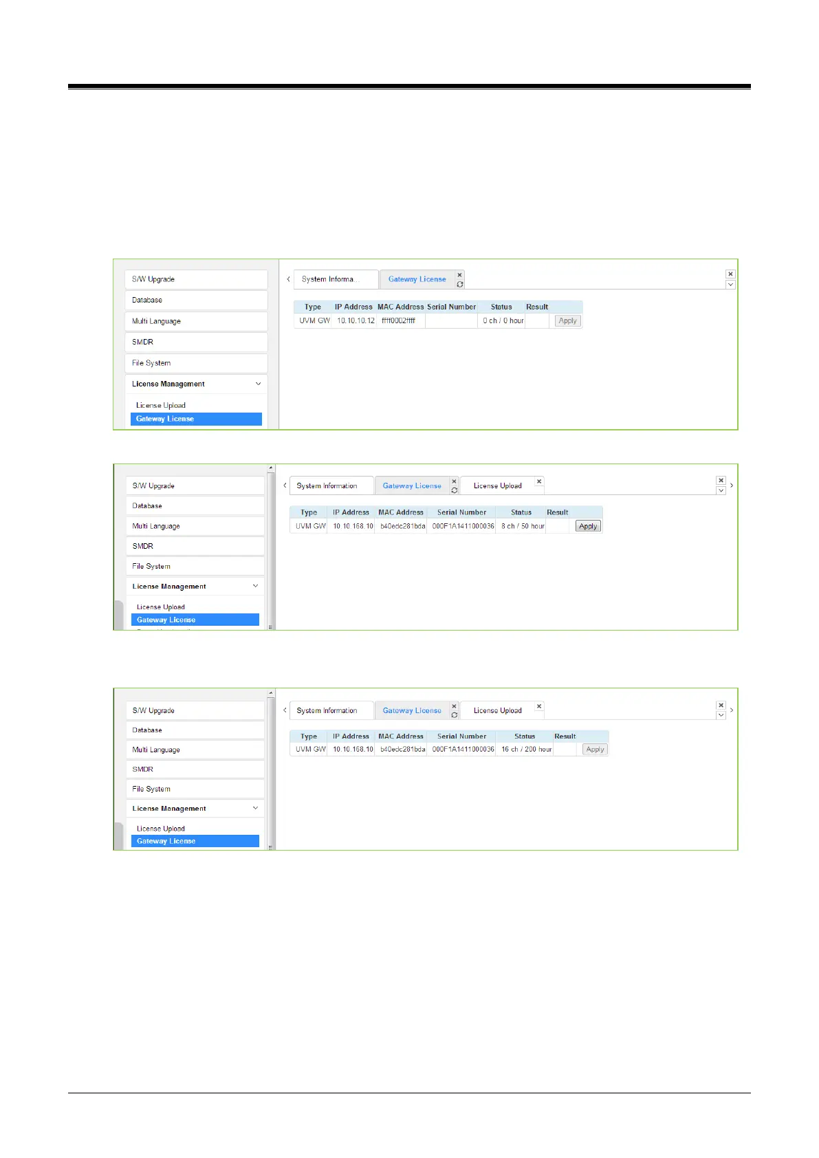 the [Apply] button will be activated. This button is used to send the license file to the gateway. After the