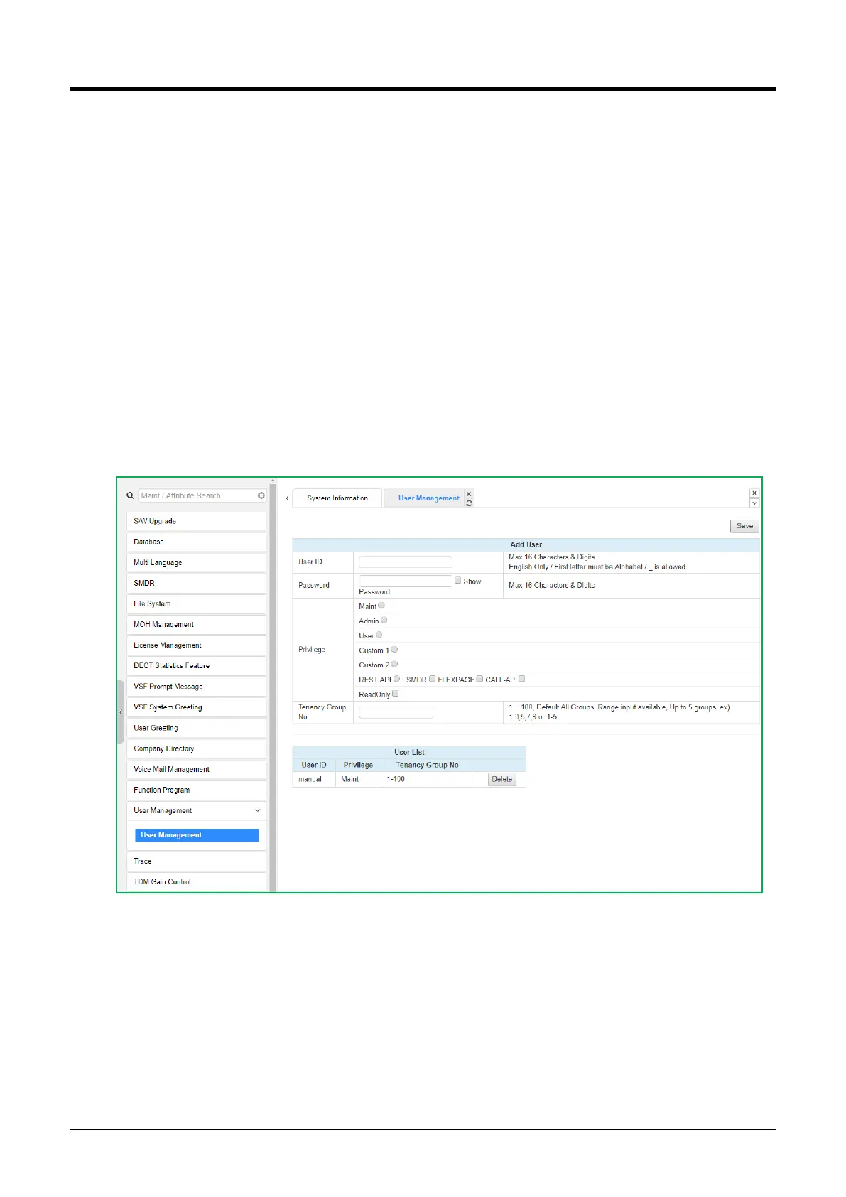 features. (SMDR, FLEXPAGE, and CALL-API)This user can't access web admin.