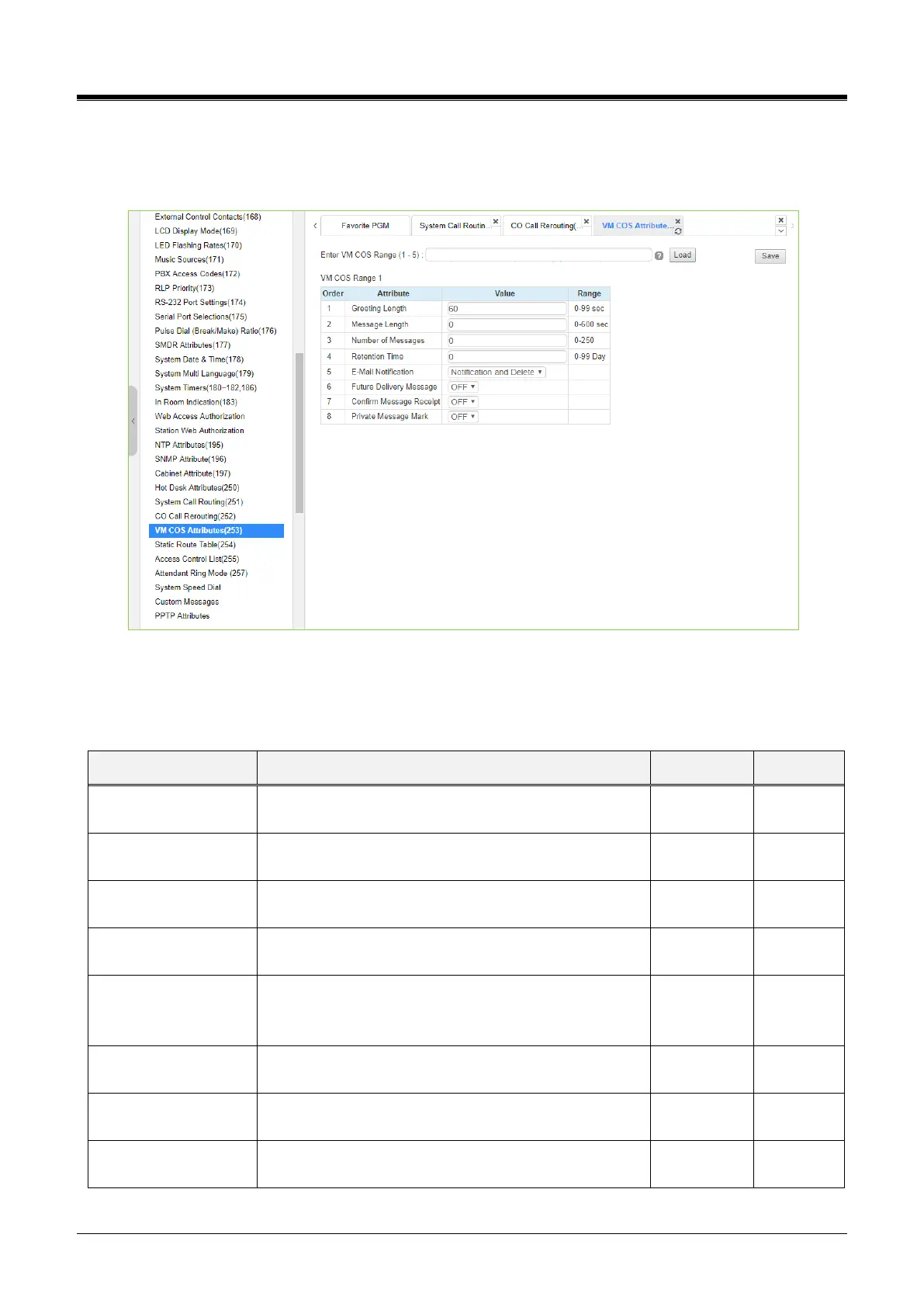 VM COS establishes various common characteristics of the user’s Voice Mailbox, including greeting and