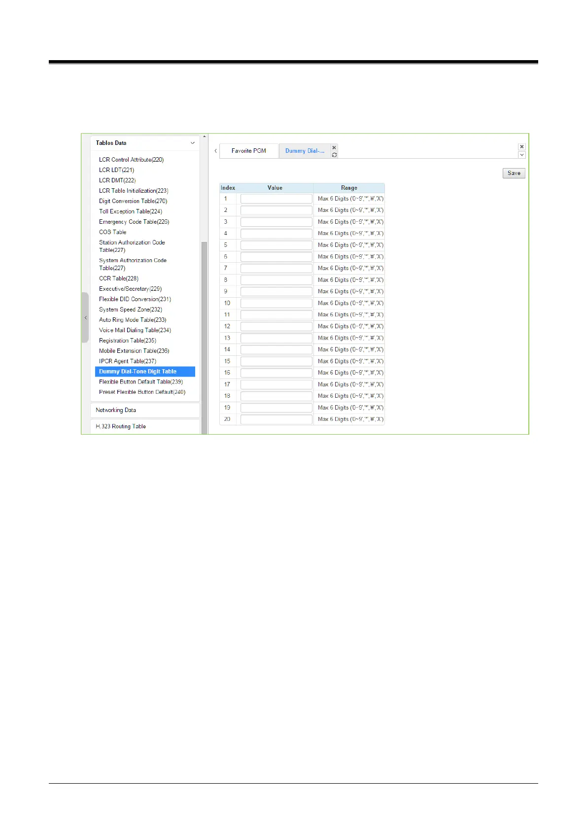 Selecting Dummy Dial-Tone Digit Table will display the Dummy Dial-Tone Digit data entry page. Click the