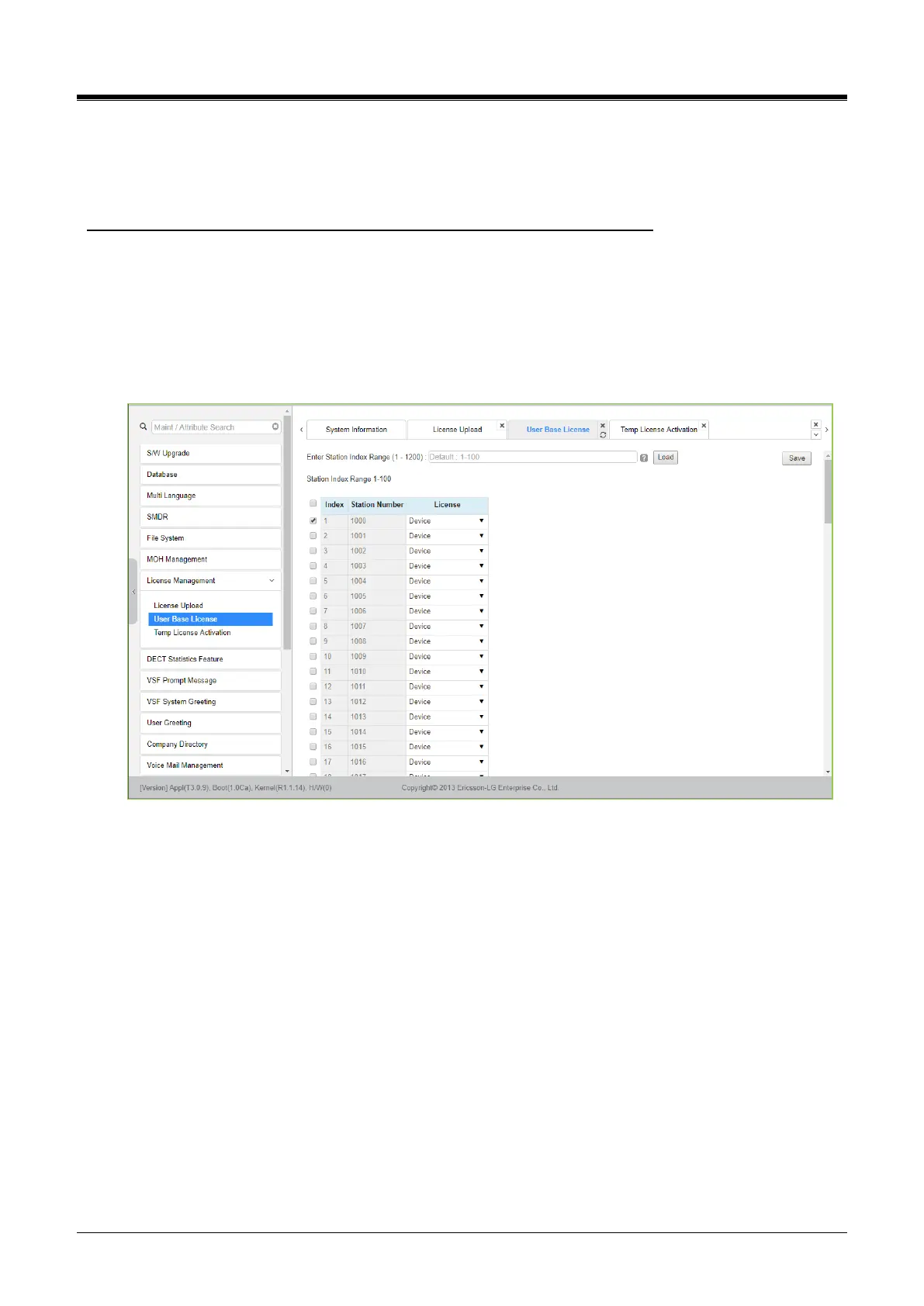 Selecting User Base License displays the license input page. Enter the station index range and click [Load] to