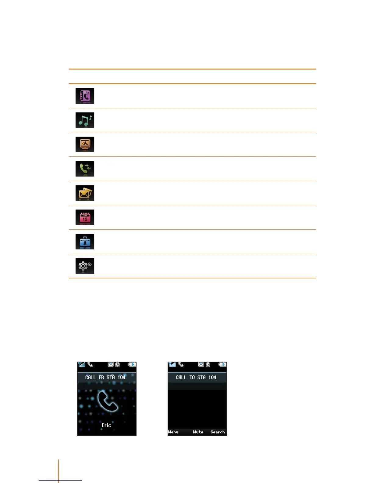 These icons are used to access the following your phone’s main