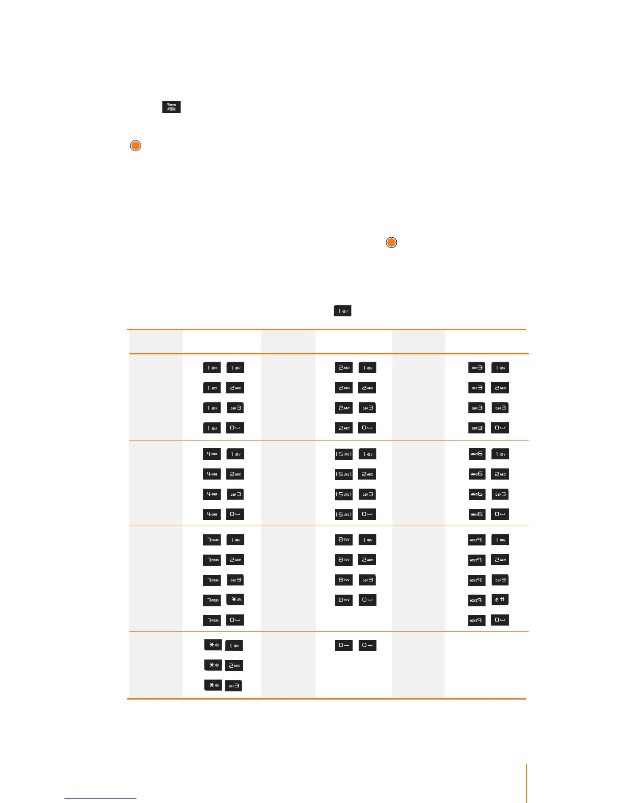 The following table describes how to enter each letter and number.