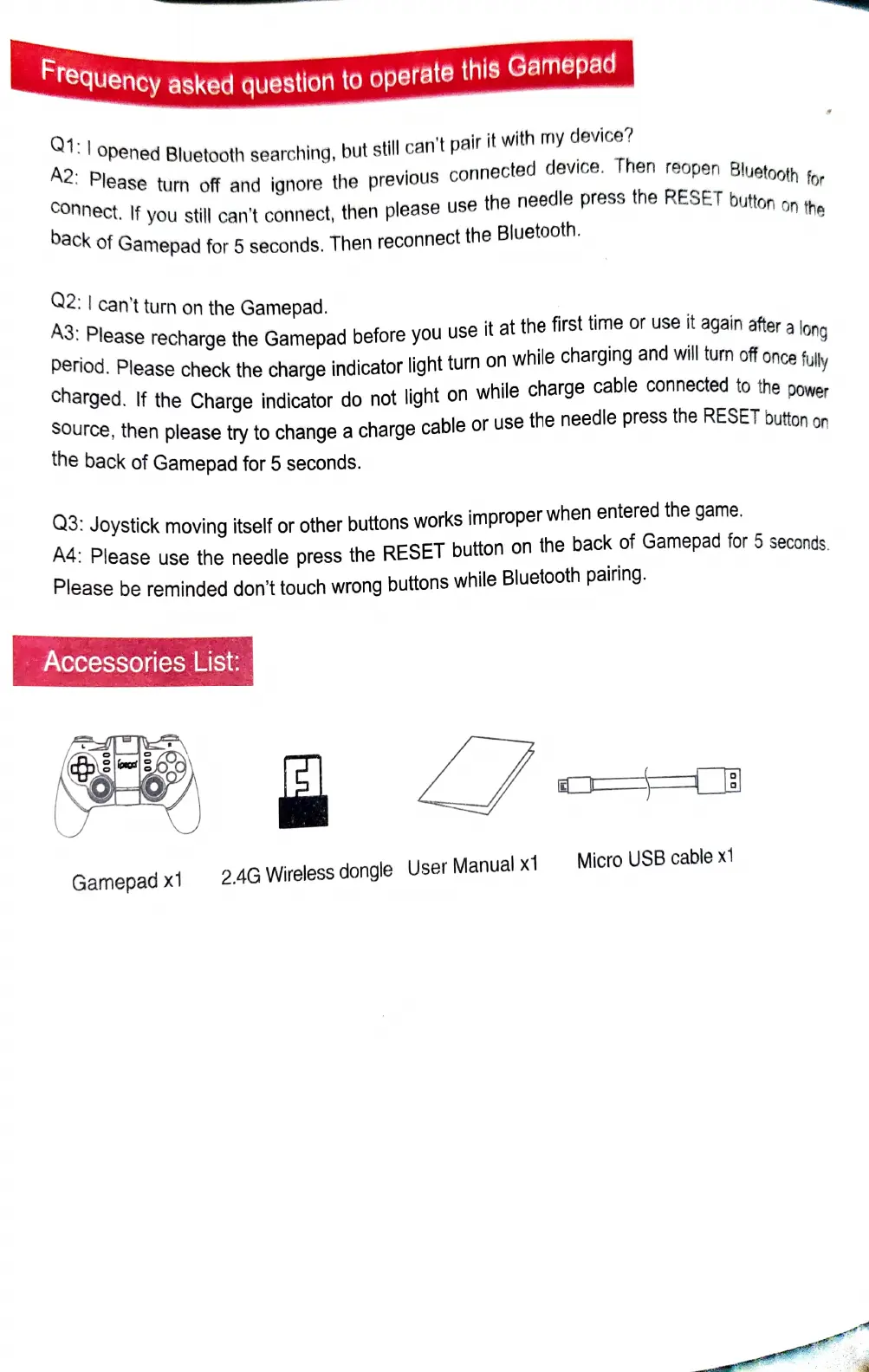 iPega Batman - Frequency Asked Questions; Pairing and Connection Issues; Power and Functionality Issues; Accessories List