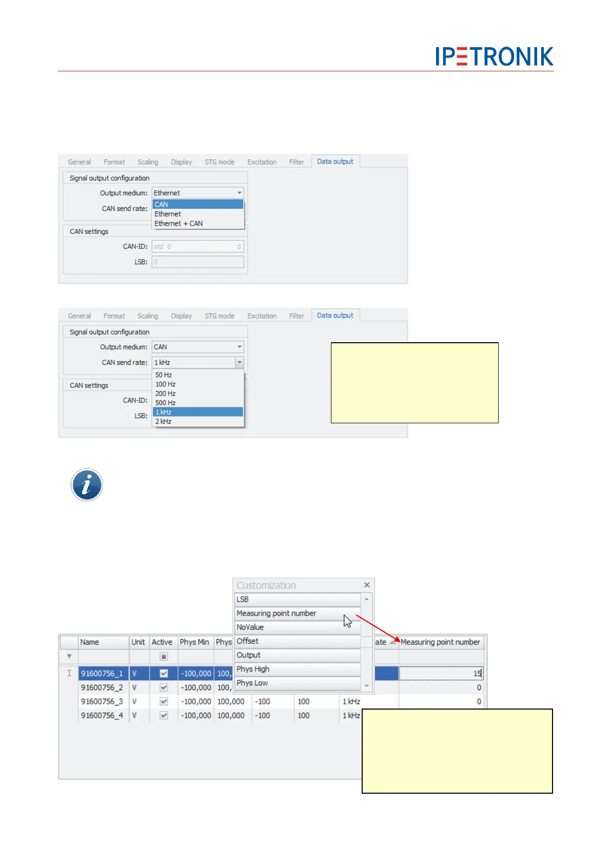 Use the Data output tab of the respective channel to output measurement signals to CAN and/or Ethernet.