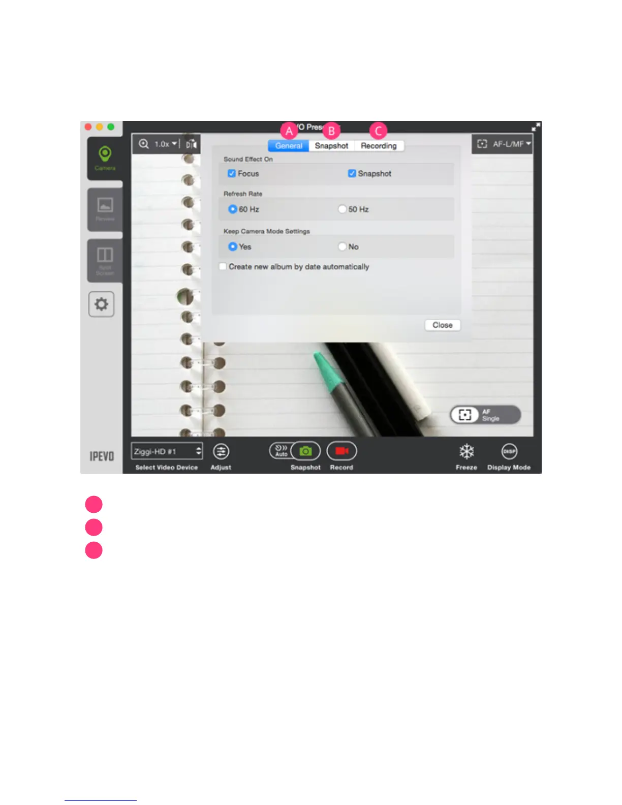 Ipevo Presenter - Application Settings; General Settings; Capture Settings; Recording Settings