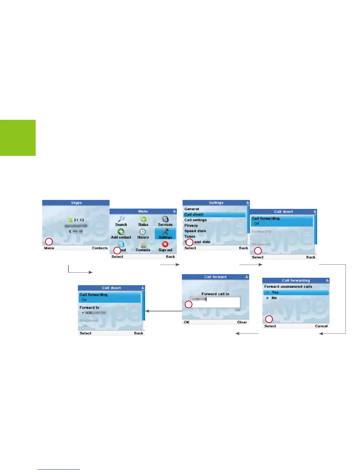 You can forward Skype calls to a landline or mobile phone number when you are away from your home or ofce.