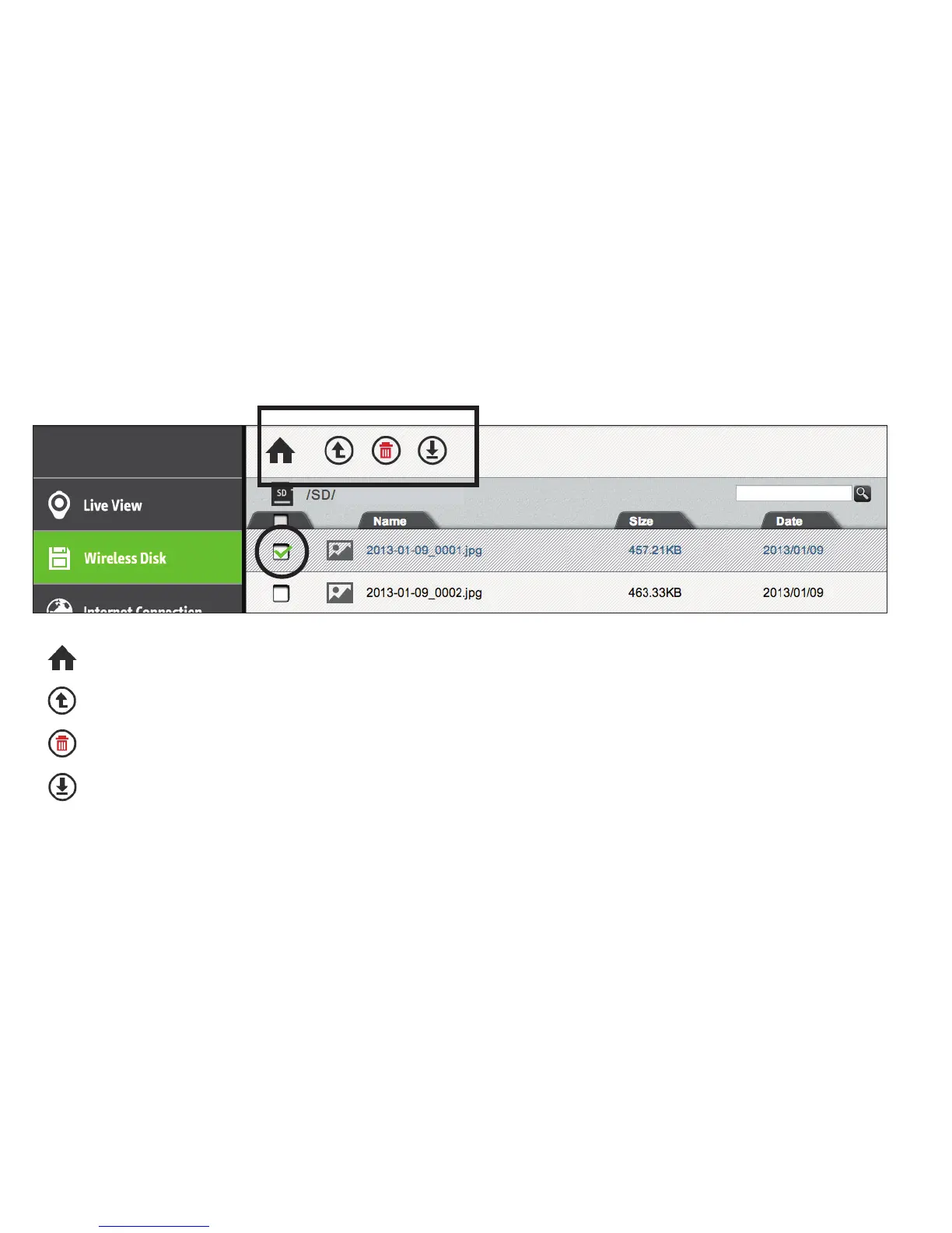 Note: for Delete and Download functions, click the white check boxes to the left of file names to mark files accordingly.