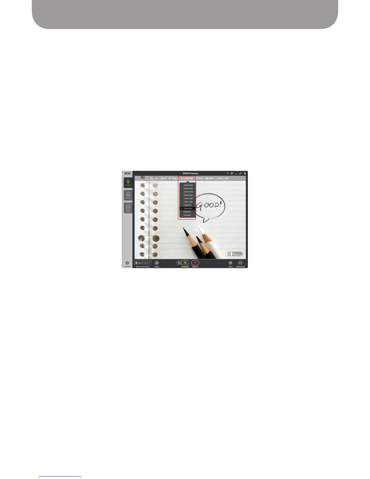 To change resolution, click on the Resolution tab in Camera mode. There are 10 different resolutions to