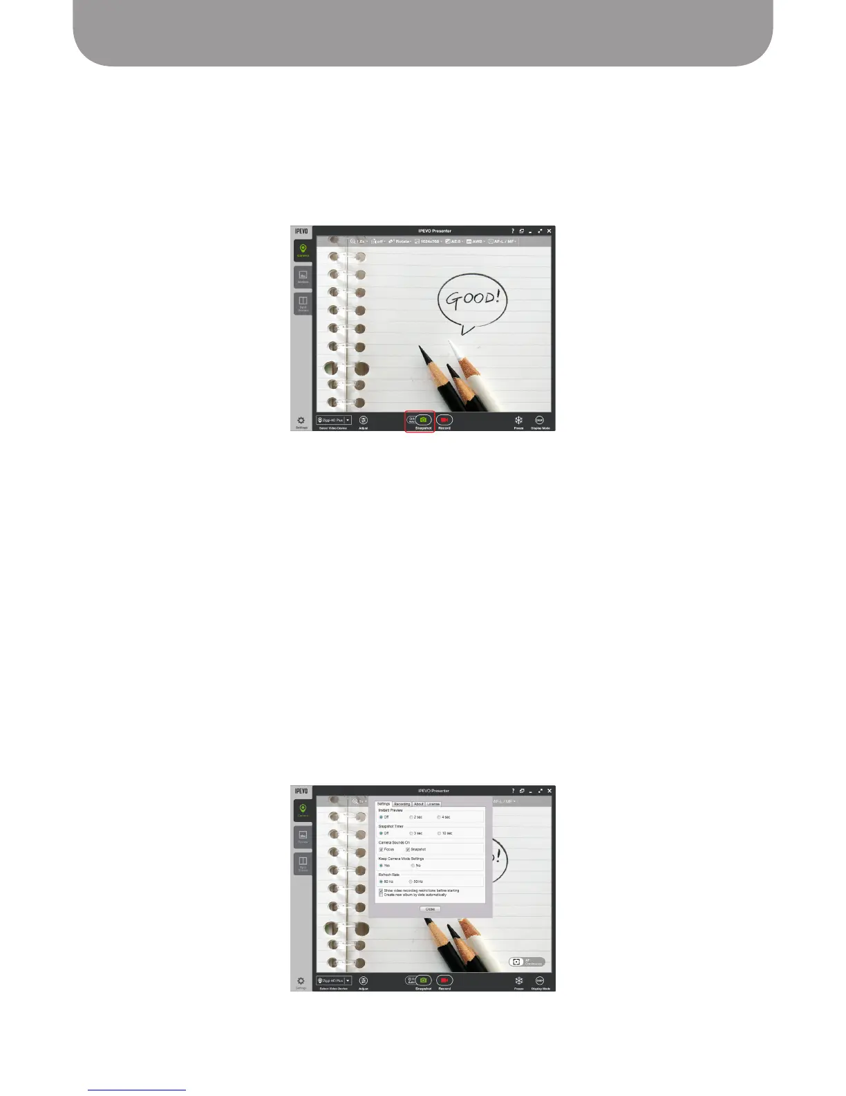 Taking a snapshot is simple – click the green camera icon at the bottom of the Presenter window in