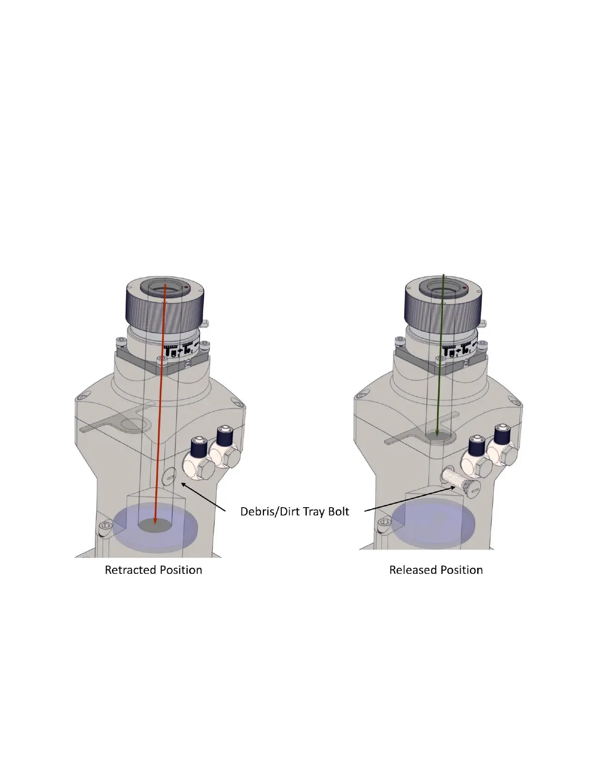 To release or retract the debris tray, simply turn the debris tray bolt accordingly.